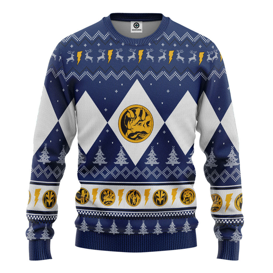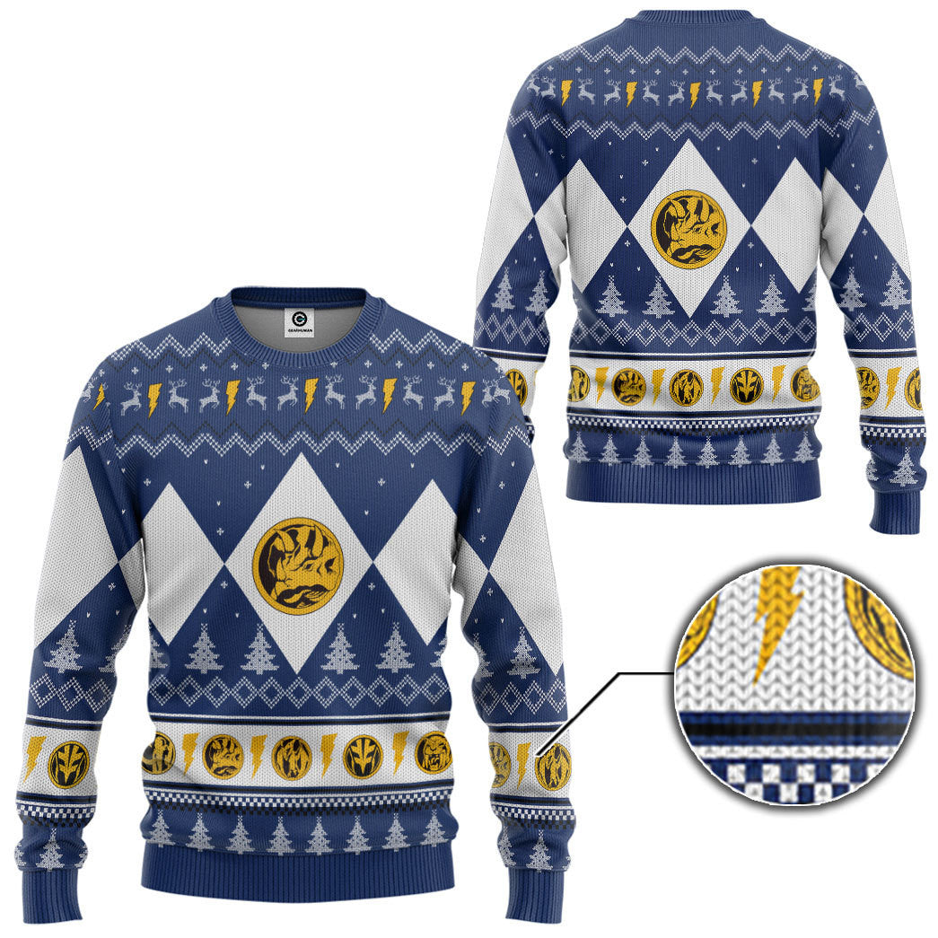 Gearhumans 3D Mighty Morphin Blue Ranger Christmas Custom Ugly Long sleeve