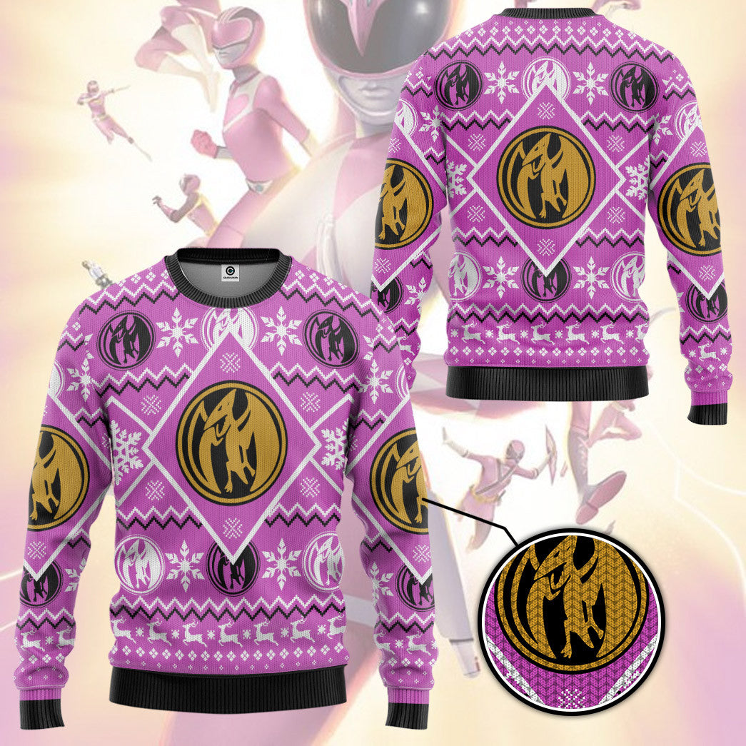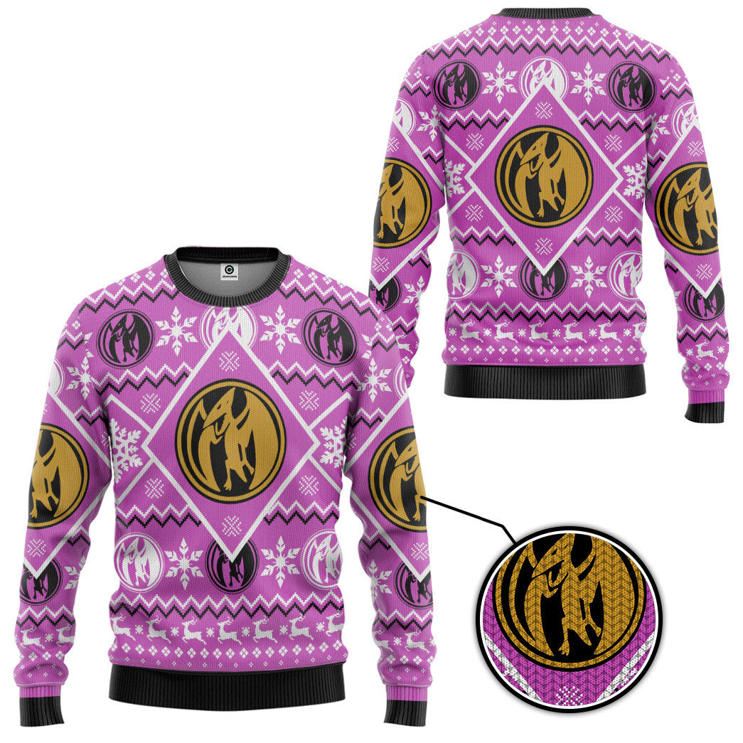 Gearhumans 3D Mighty Morphin Pink Power Ranger Custom Ugly Christmas Long sleeve