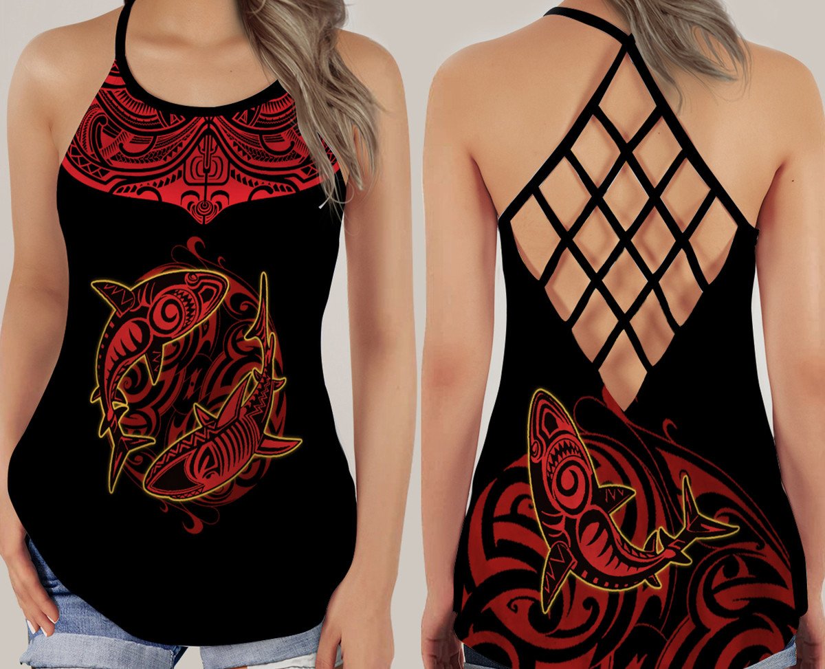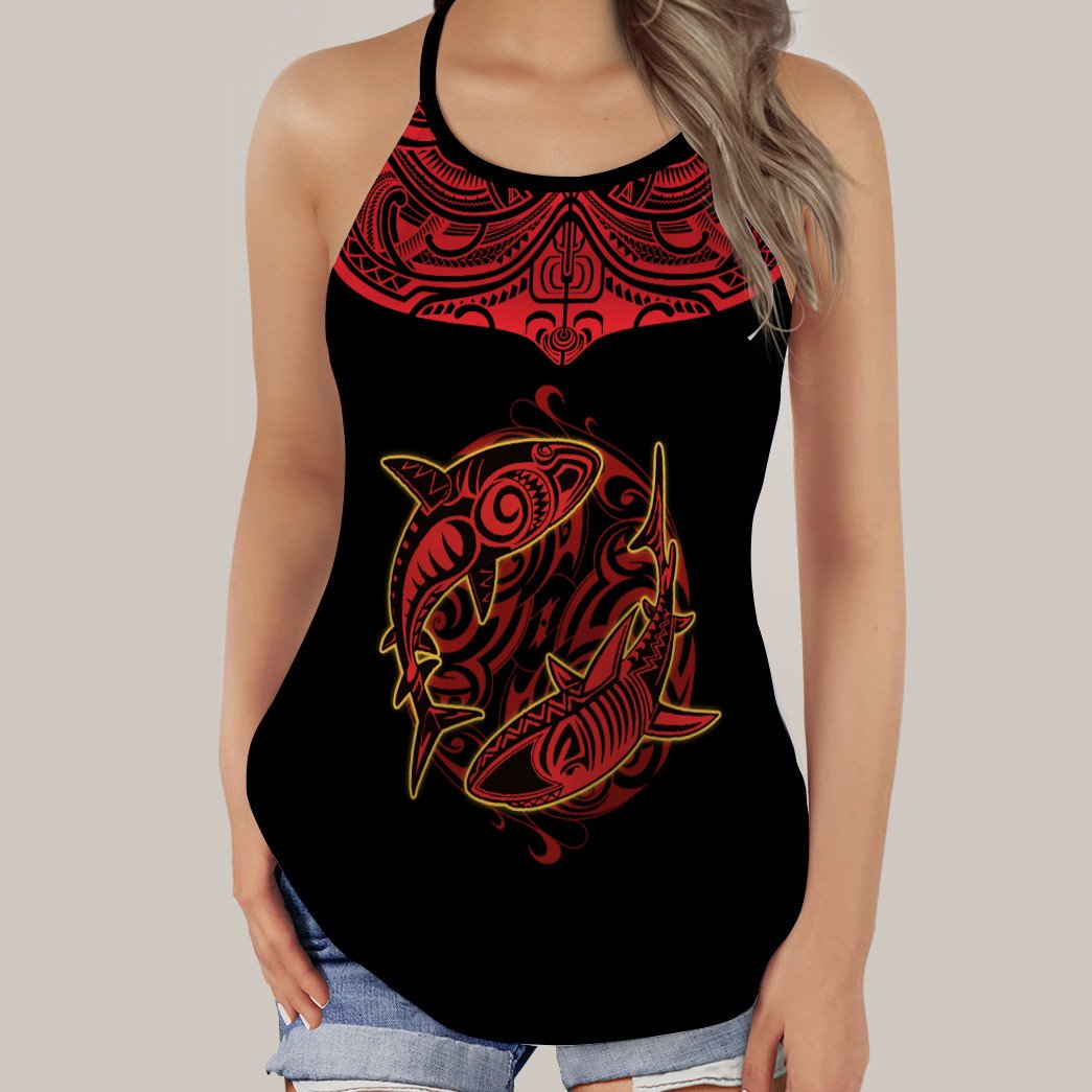 Gearhumans 3D Shark Fishing Polynesian Custom Cross Tank Top