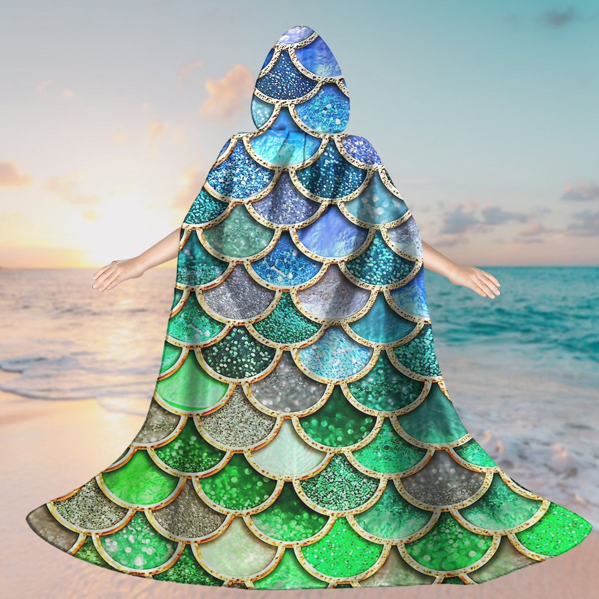 Gearhumans 3D The Most Green And Blue Sparkle Mermaid Tail In The Ocean Custom Hooded Cloak